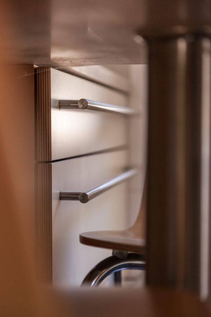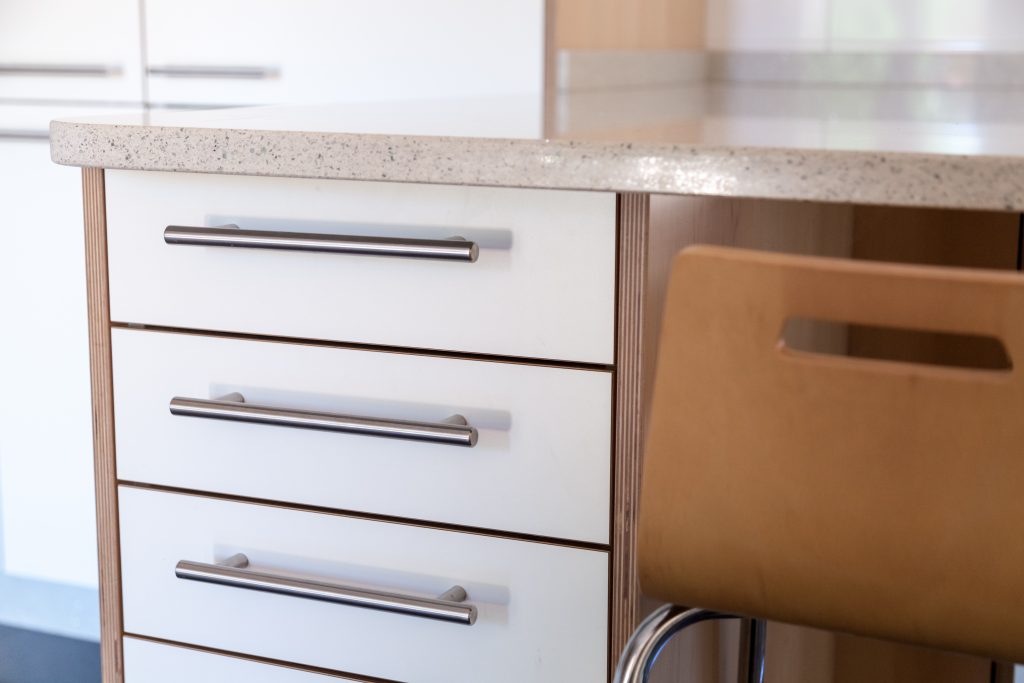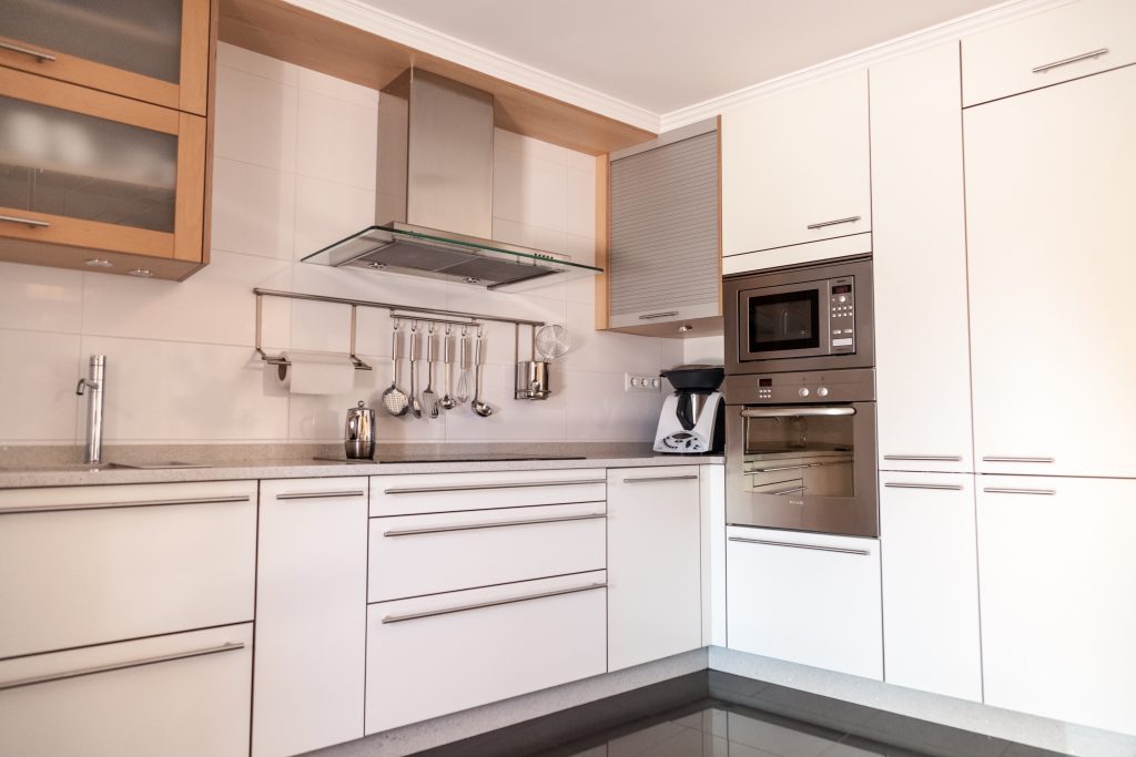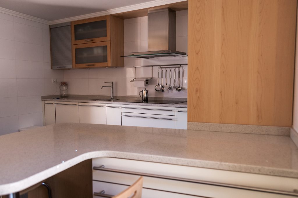 El objetivo de Decoiglesias en este proyecto es aprovechar al máximo la luz natural y crear un espacio cómodo y práctico. Los muebles de esta cocina son de madera laminada, las encimeras son de cuarzo en tonos naturales en contraste con el suelo en color gris oscuro.